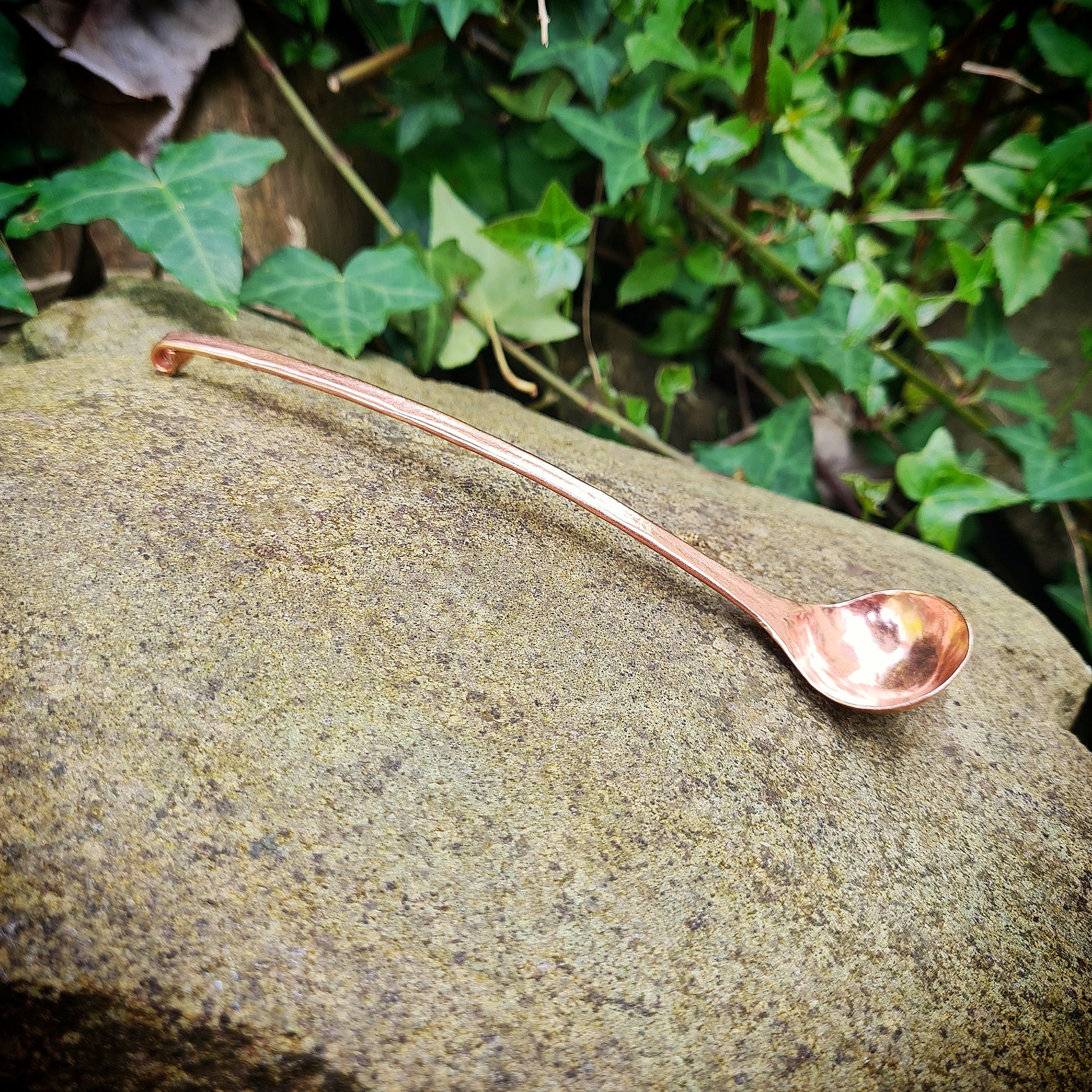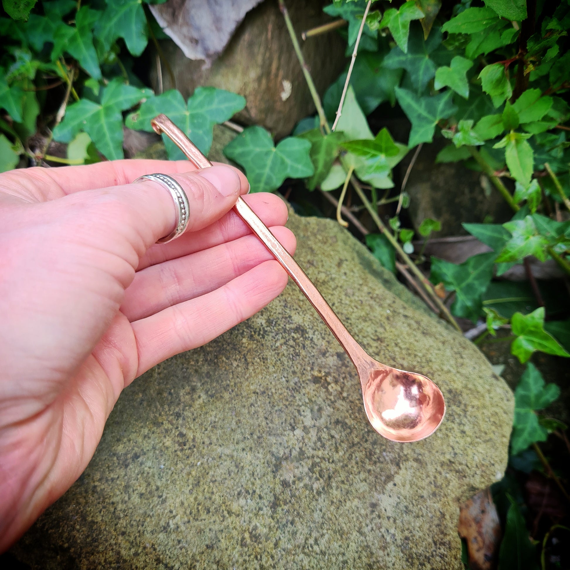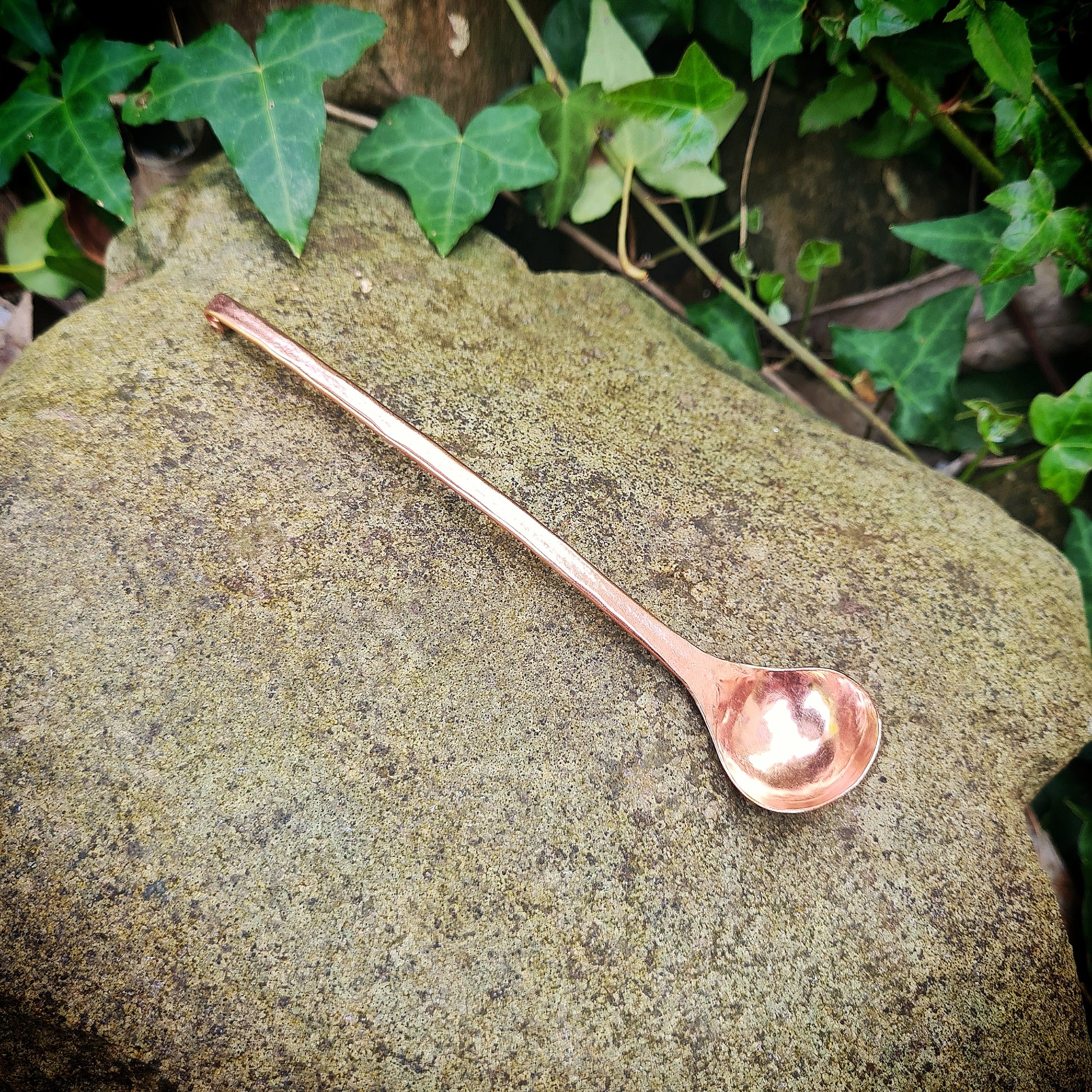 This spoon is made from pure untreated copper and should not be used in liquids or wet foods. The copper will affect the taste of the food, and in very very rare circumstances create harmful by-products.